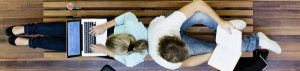 Top view of male and female university students studying